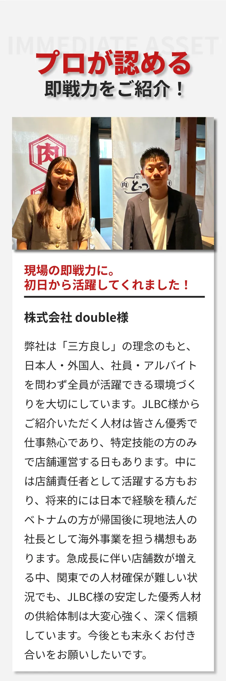 紹介した人材の中には店長や責任者として活躍するケースも増えており、「単なる人手」ではなく「戦力」として評価されています。採用難が続く中でも安定的に優秀人材を供給できることが、double様からの深い信頼につながっています。