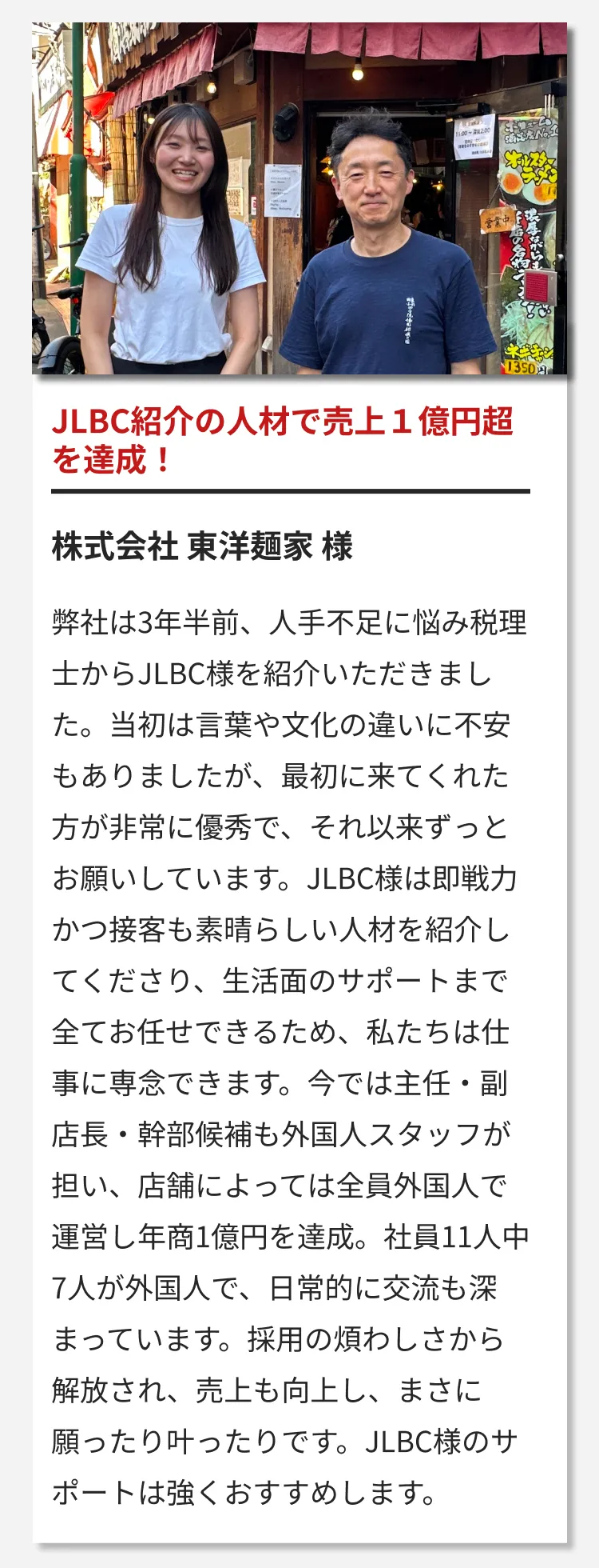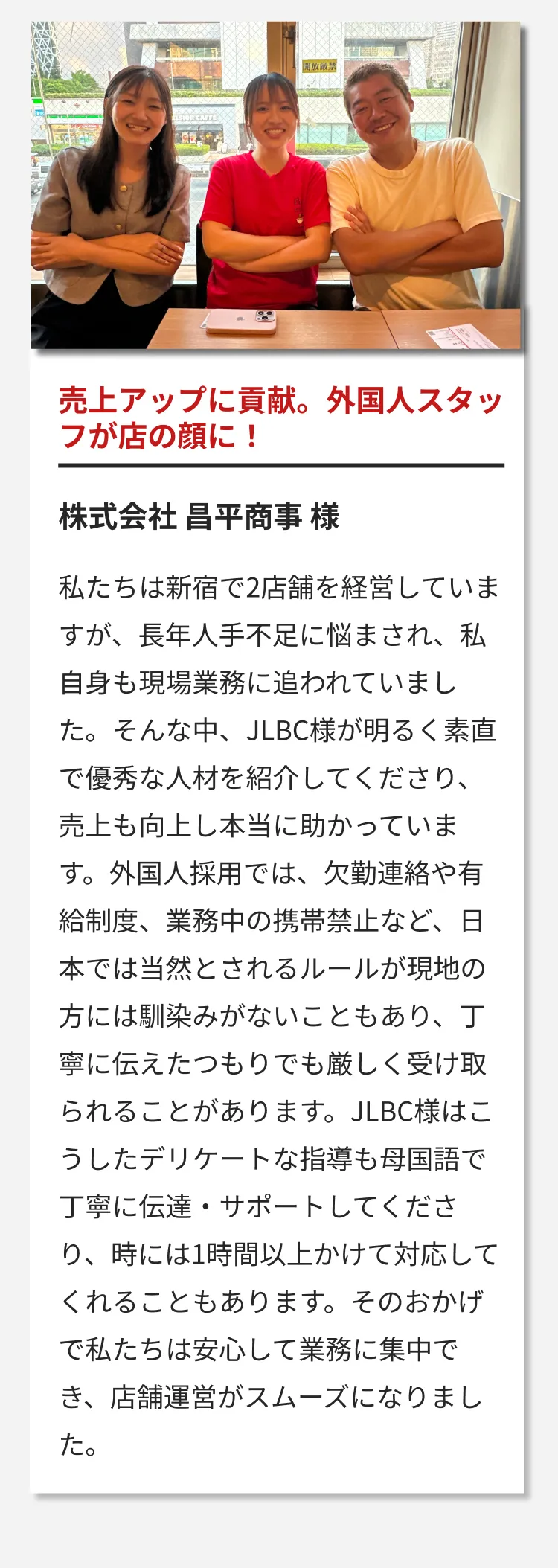 JLBCを通じて外国人材を導入した企業の、実際の声と成果をご紹介します。