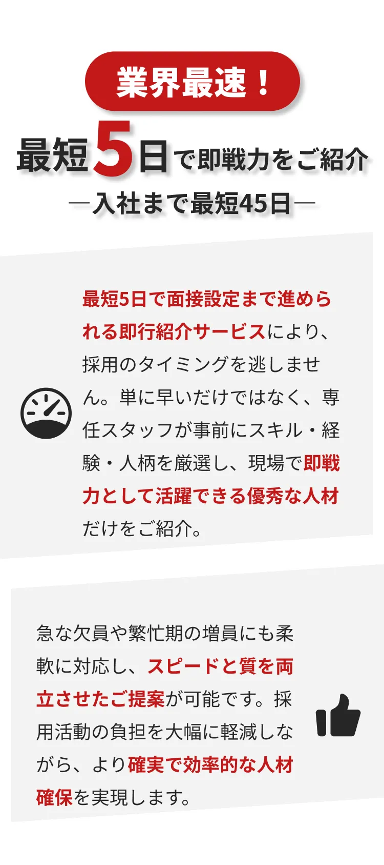 要件共有から配属まで短期で完結し、出店計画に合わせて必要人数を確保します。