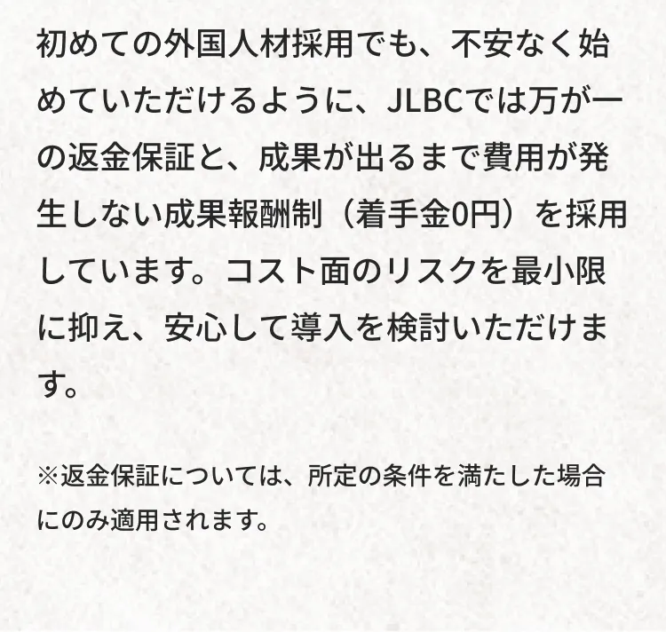 JLBCでは語学力や人柄だけでなく、外食・食品製造業に向いているかどうかという独自の基準で候補者を選定。“とりあえず紹介”ではない、本当に必要な人材だけをお届けします。