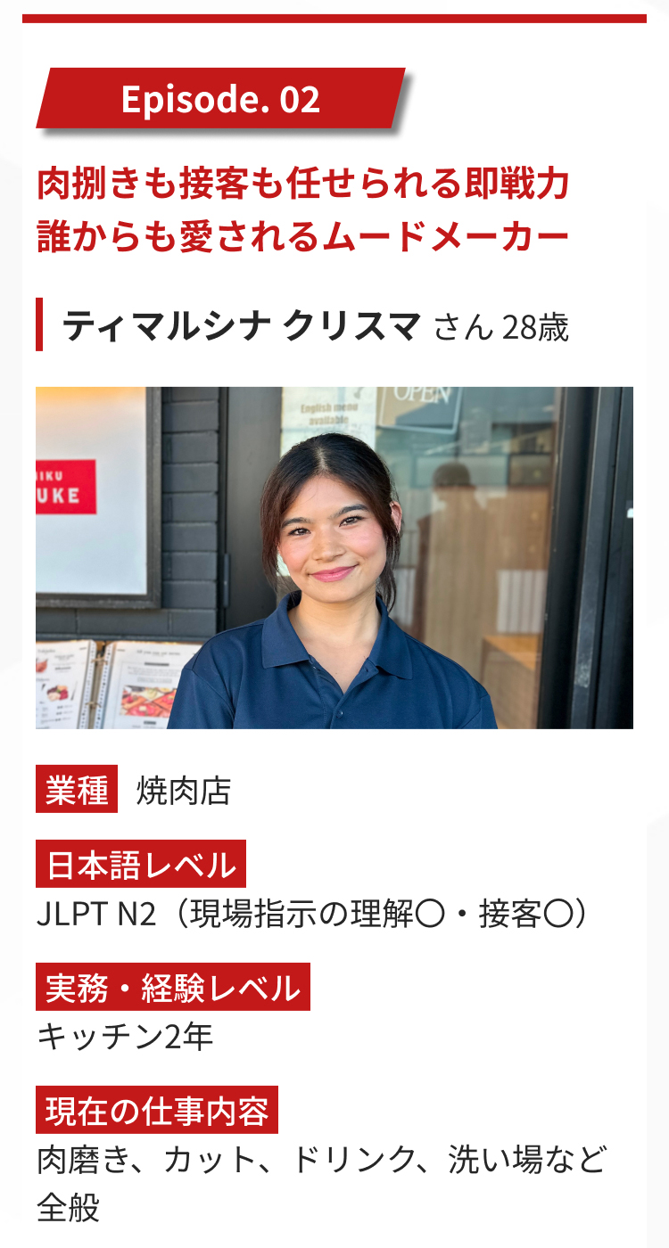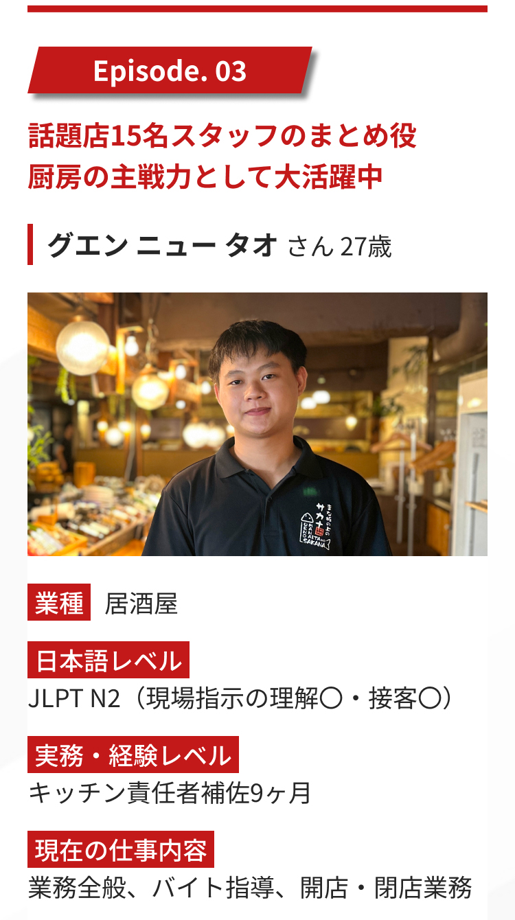 在日通算6年以上。語学学校での留学経験と飲食店アルバイトを経て、JLBCを通じて飲食業界へ復帰。入社9ヶ月でキッチン責任者補佐を任され、アルバイト指導も担うリーダー的存在。