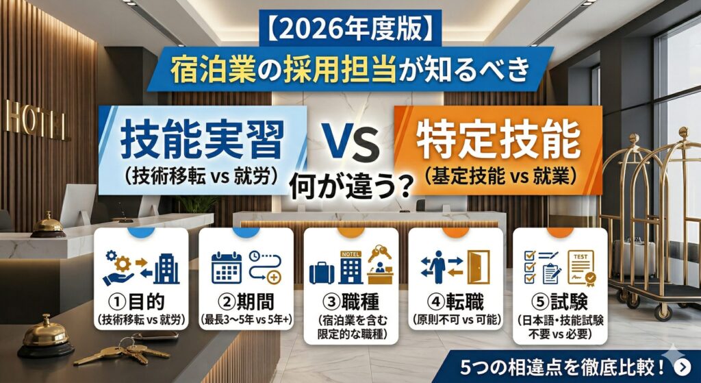 【2026年度版】「技能実習」と「特定技能」は何が違う?宿泊業の採用担当が知るべき5つの相違点