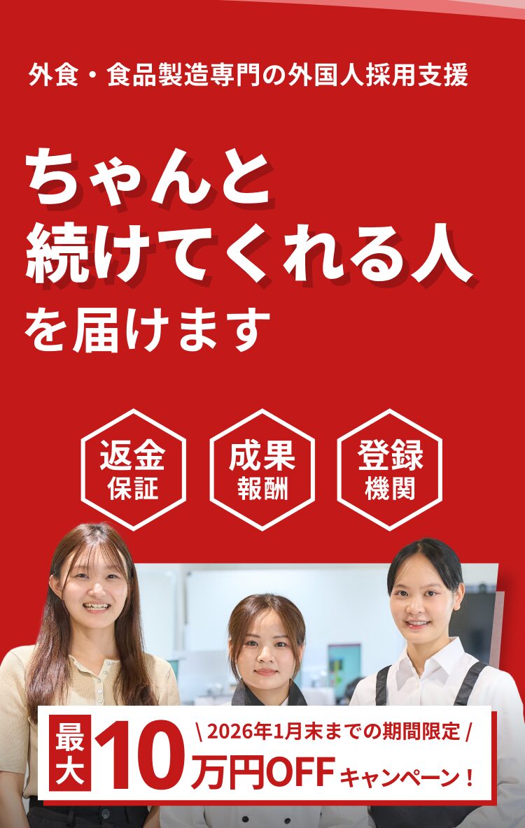 特定技能人材を中心に、店舗運営を任せられる即戦力スタッフから、将来の責任者候補まで幅広く紹介。大型チェーンならではの大量採用ニーズにも柔軟に対応し、安定した供給体制を実現しています。