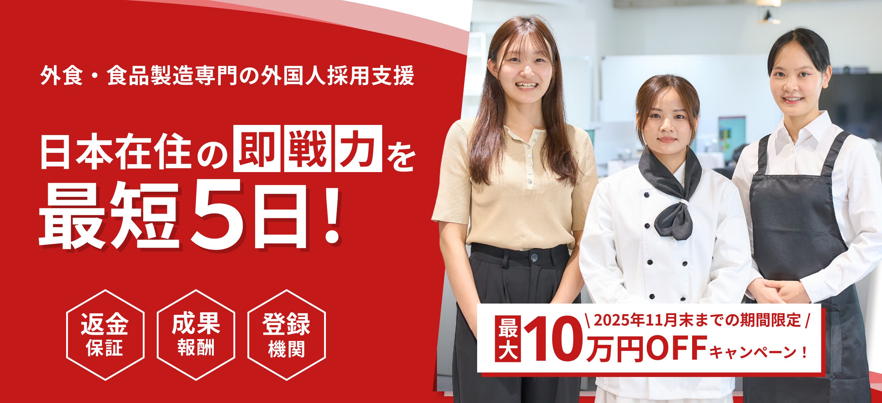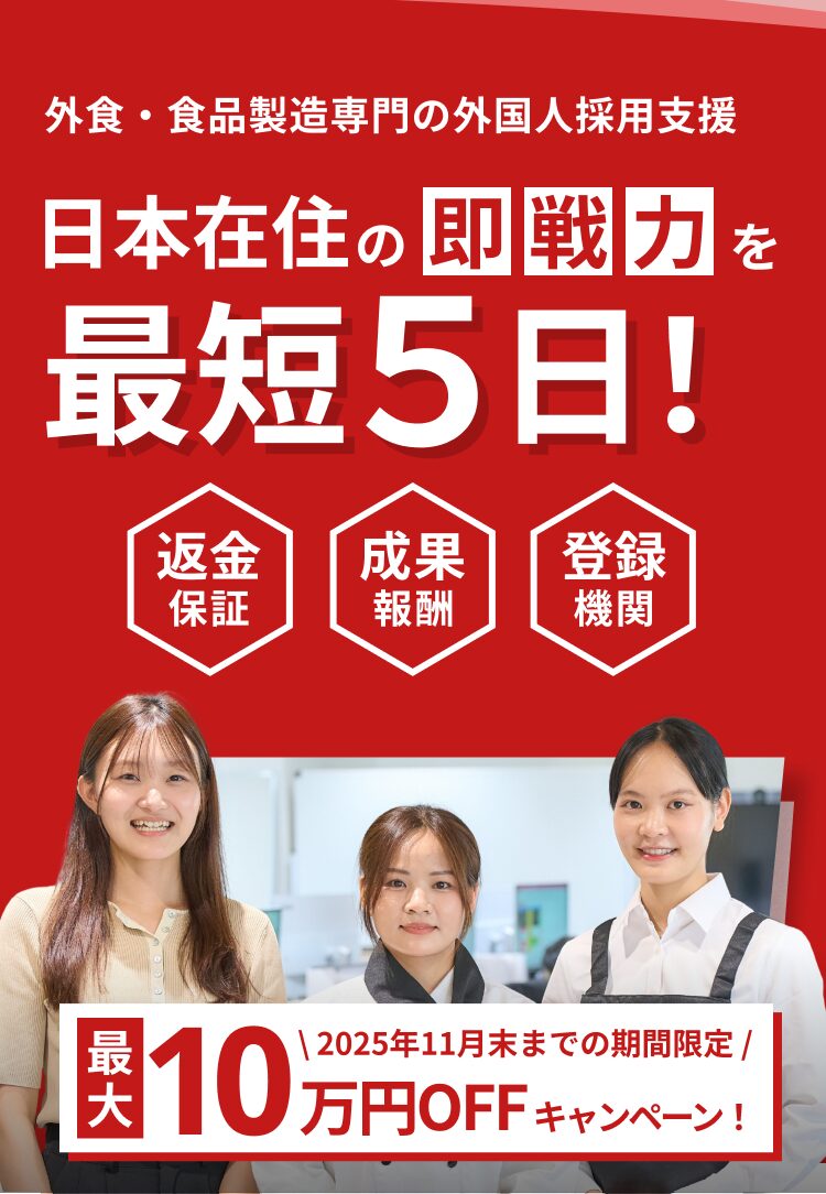 特定技能人材を中心に、店舗運営を任せられる即戦力スタッフから、将来の責任者候補まで幅広く紹介。大型チェーンならではの大量採用ニーズにも柔軟に対応し、安定した供給体制を実現しています。
