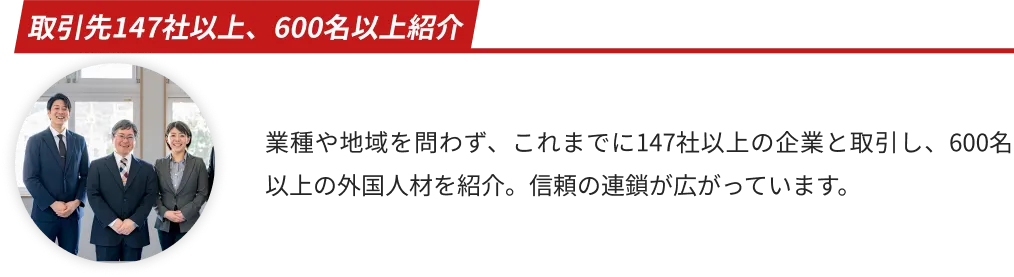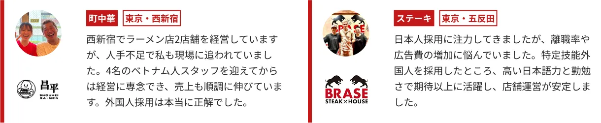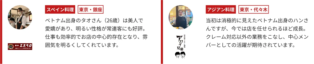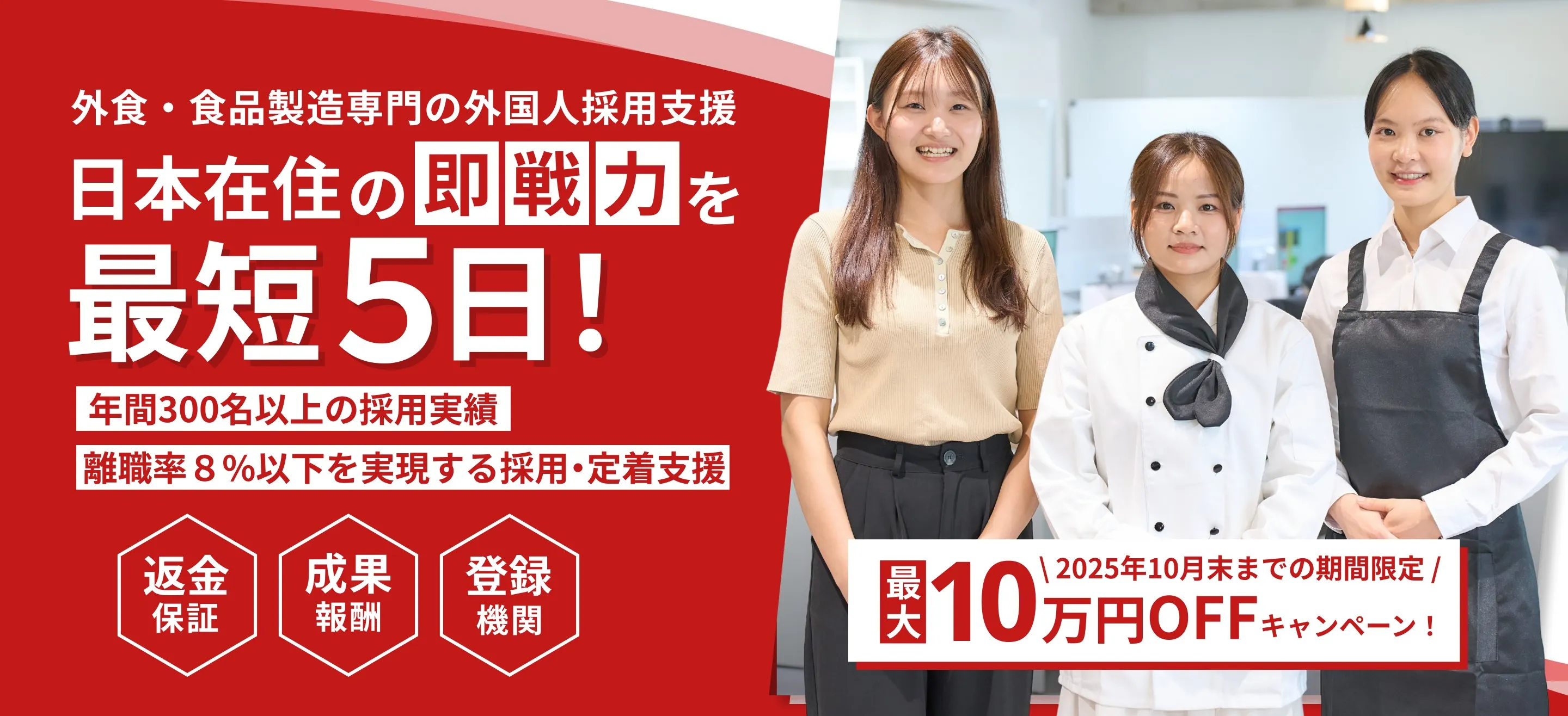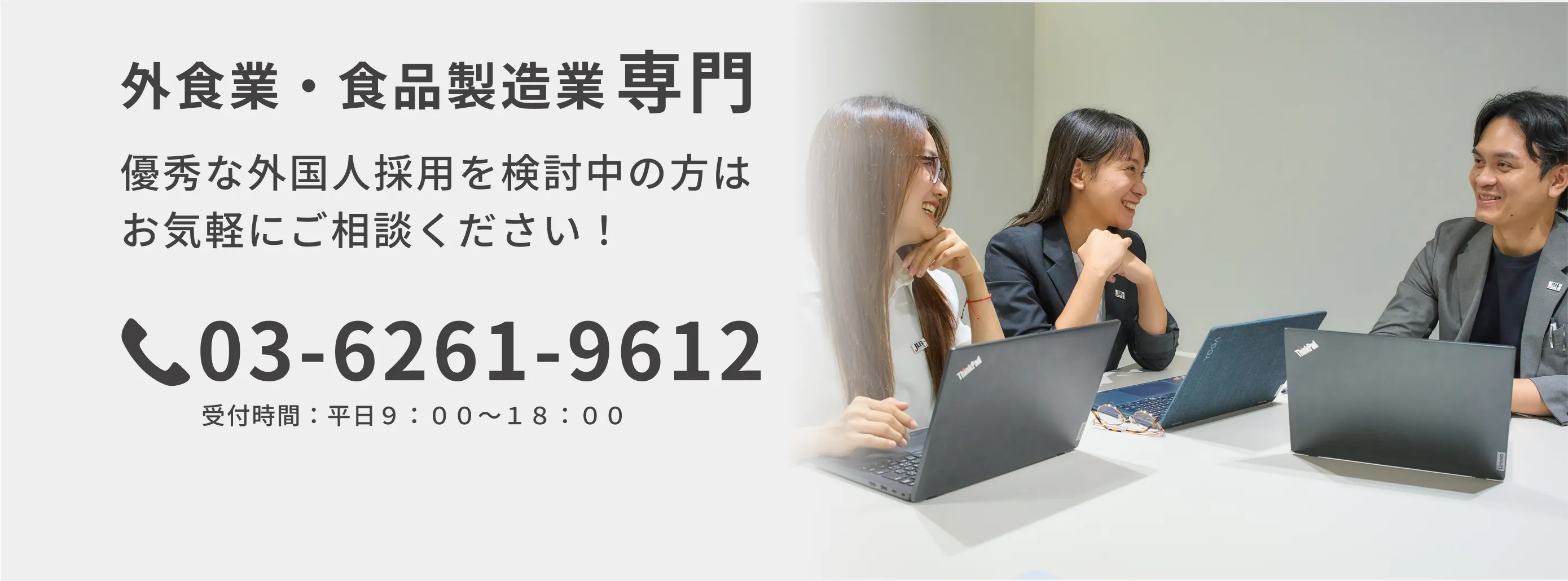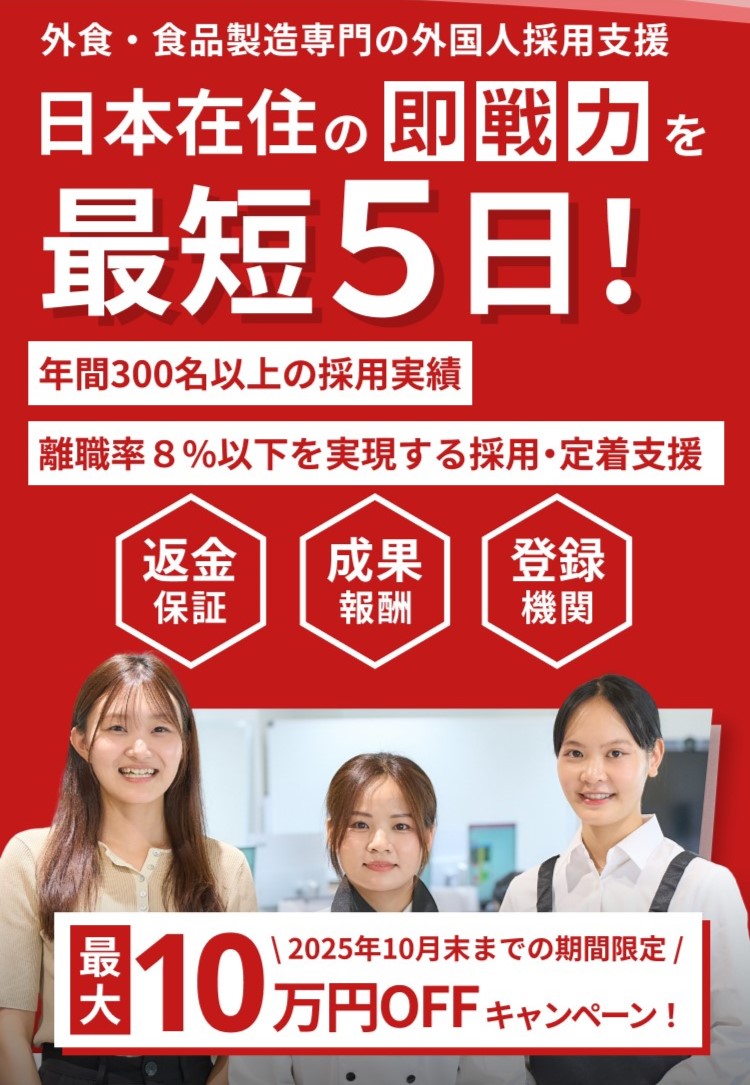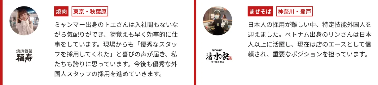 特定技能人材を中心に、店舗運営を任せられる即戦力スタッフから、将来の責任者候補まで幅広く紹介。大型チェーンならではの大量採用ニーズにも柔軟に対応し、安定した供給体制を実現しています。
