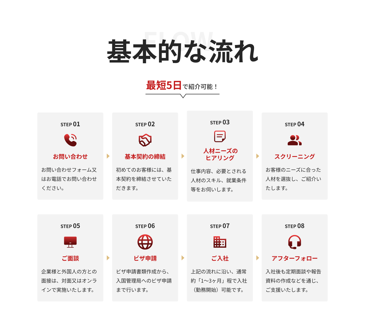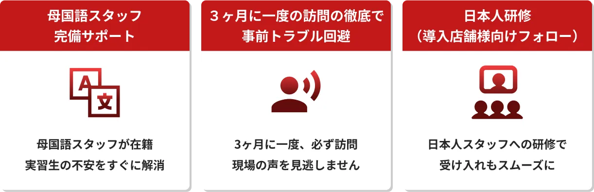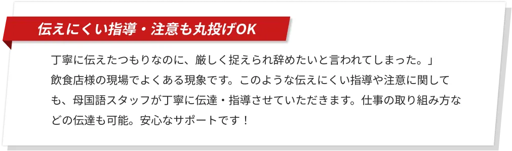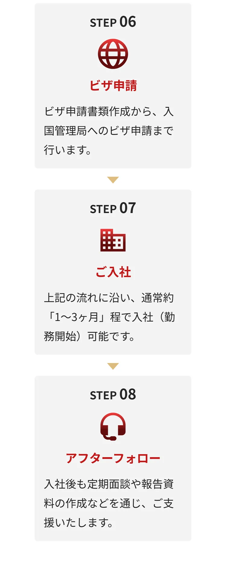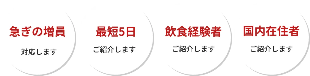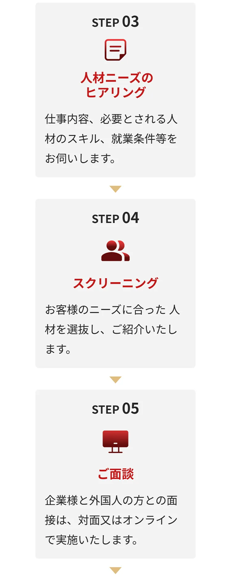 特定技能人材を中心に、店舗運営を任せられる即戦力スタッフから、将来の責任者候補まで幅広く紹介。大型チェーンならではの大量採用ニーズにも柔軟に対応し、安定した供給体制を実現しています。