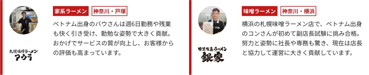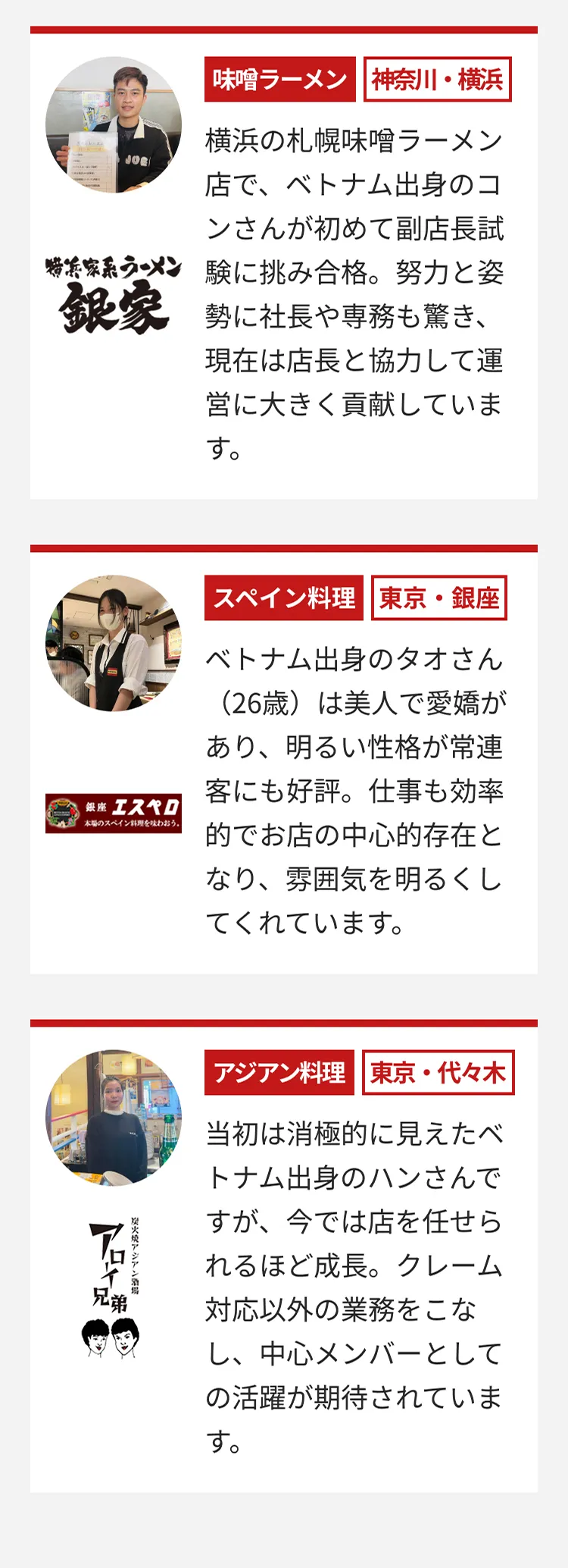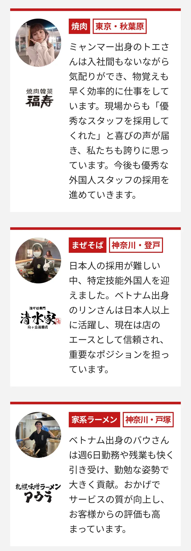 弊社は「三方良し」の理念のもと、日本人・外国人、社員・アルバイトを問わず全員が活躍できる環境づくりを大切にしています。JLBC様からご紹介いただく人材は皆さん優秀で仕事熱心であり、特定技能の方のみで店舗運営する日もあります。中には店舗責任者として活躍する方もおり、将来的には日本で経験を積んだベトナムの方が帰国後に現地法人の社長として海外事業を担う構想もあります。急成長に伴い店舗数が増える中、関東での人材確保が難しい状況でも、JLBC様の安定した優秀人材の供給体制は大変心強く、深く信頼しています。今後とも末永くお付き合いをお願いしたいです。