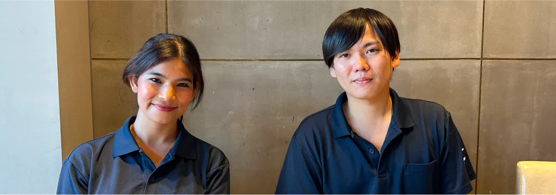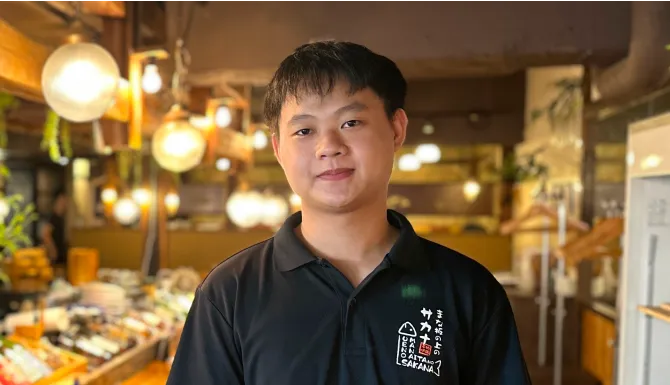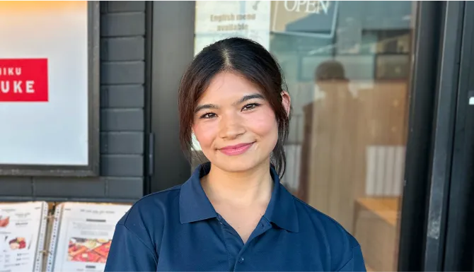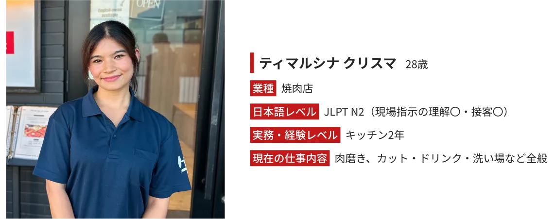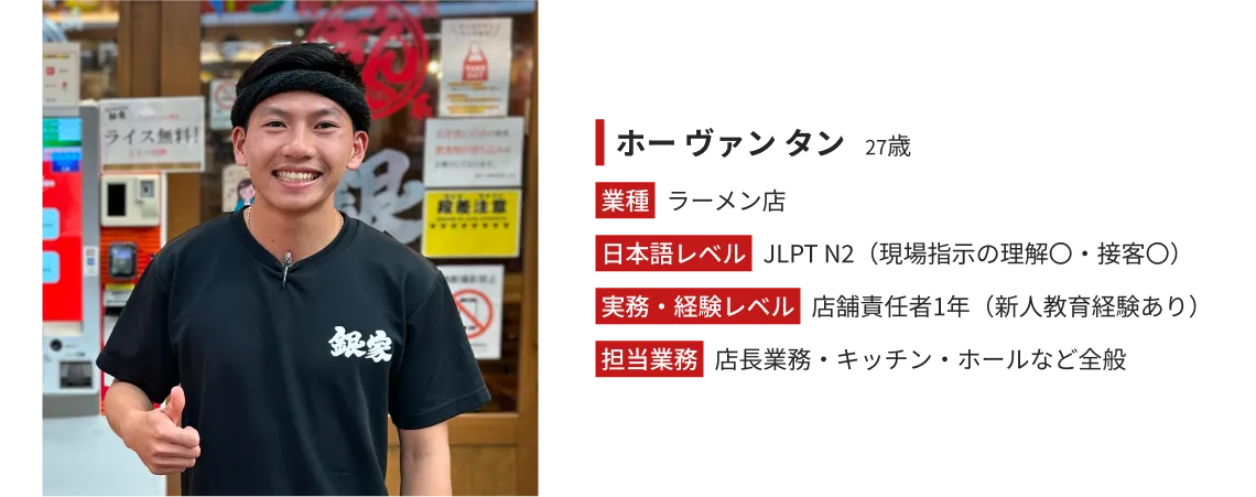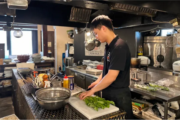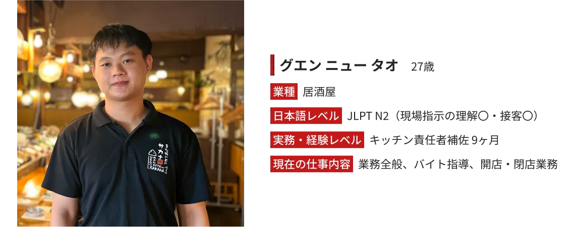 在日通算6年以上。語学学校での留学経験と飲食店アルバイトを経て、JLBCを通じて飲食業界へ復帰。入社9ヶ月でキッチン責任者補佐を任され、ホール業務・アルバイト指導も担うリーダー的存在。