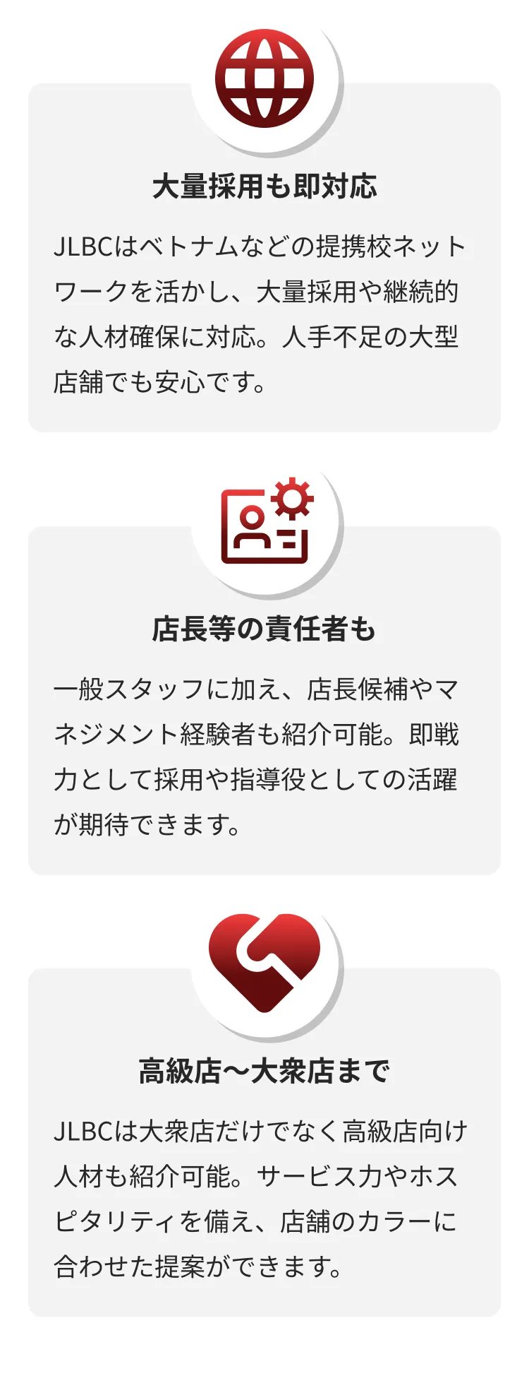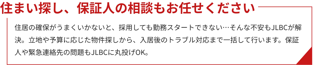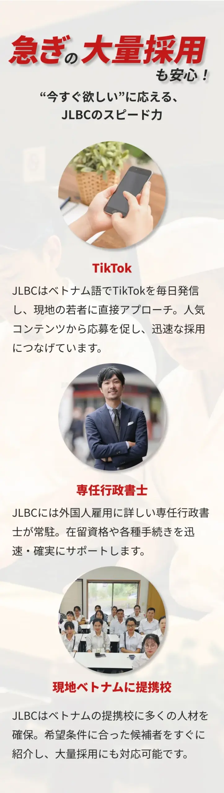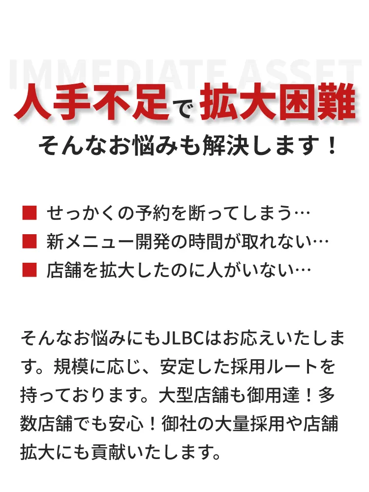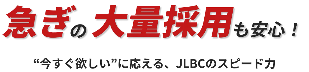 そんなお悩みにもJLBCはお応えいたします。規模に応じ、安定した採用ルートを持っております。