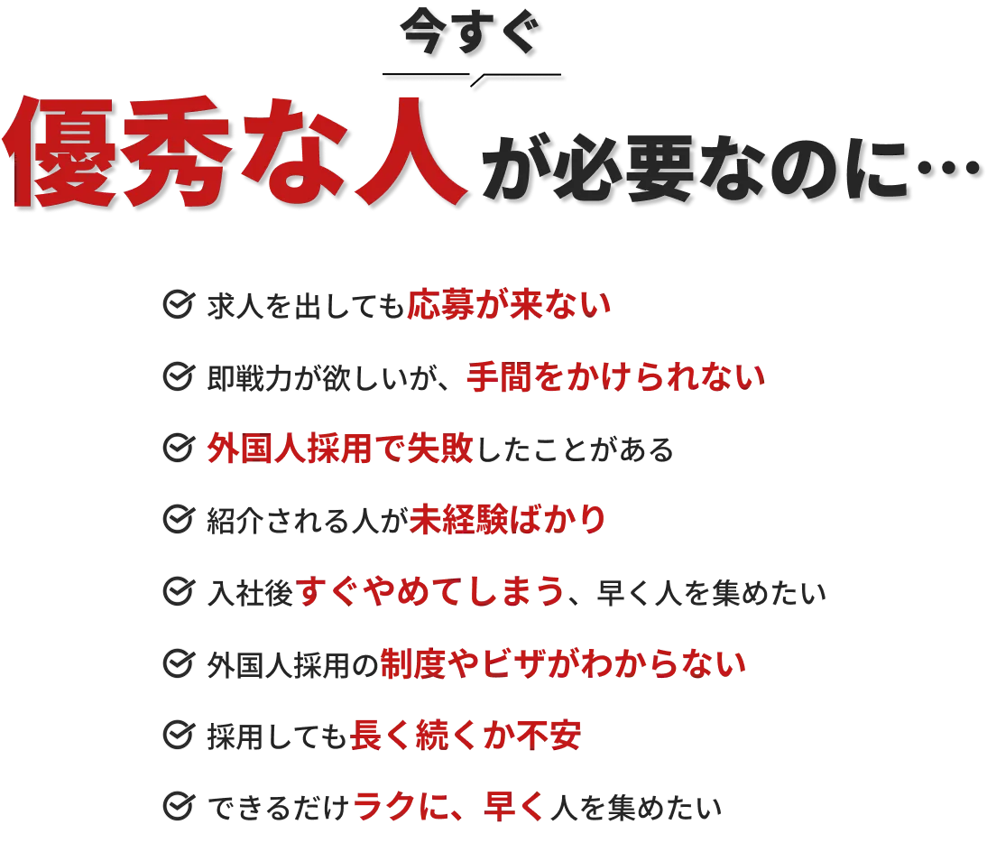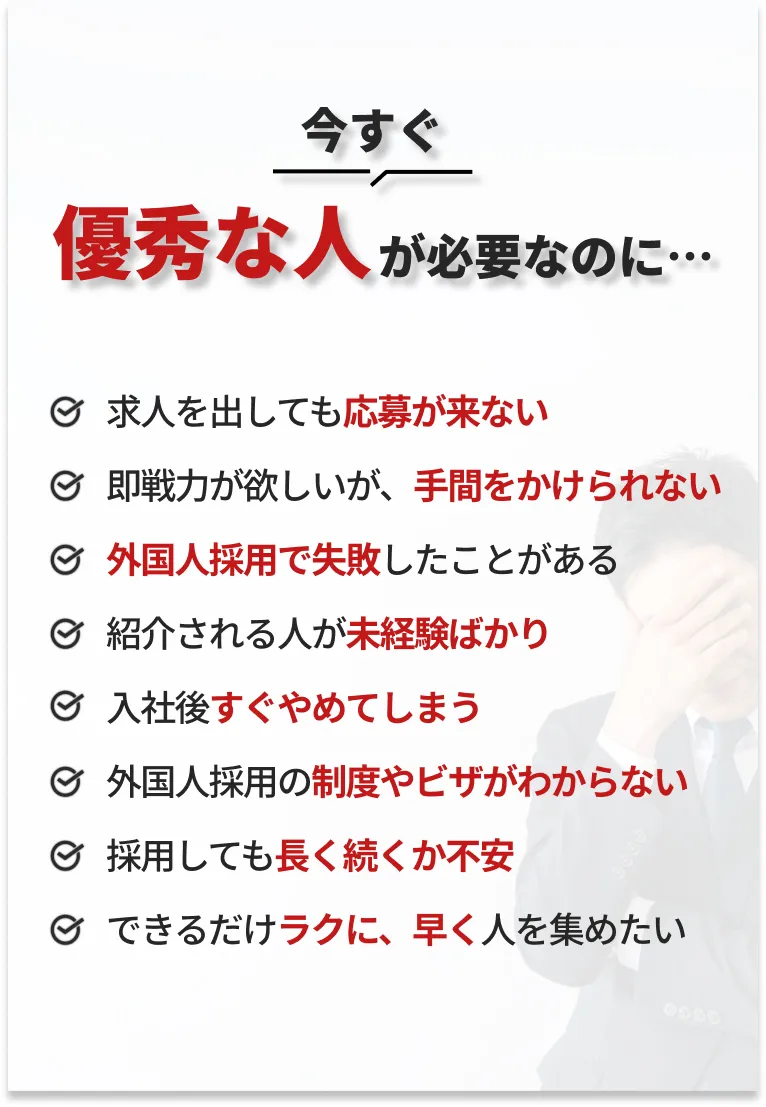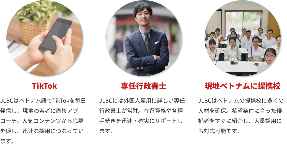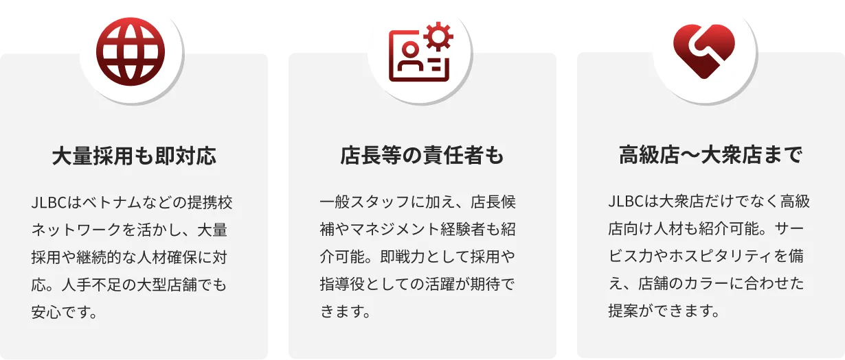 そんなお悩みにもJLBCはお応えいたします。規模に応じ、安定した採用ルートを持っております。