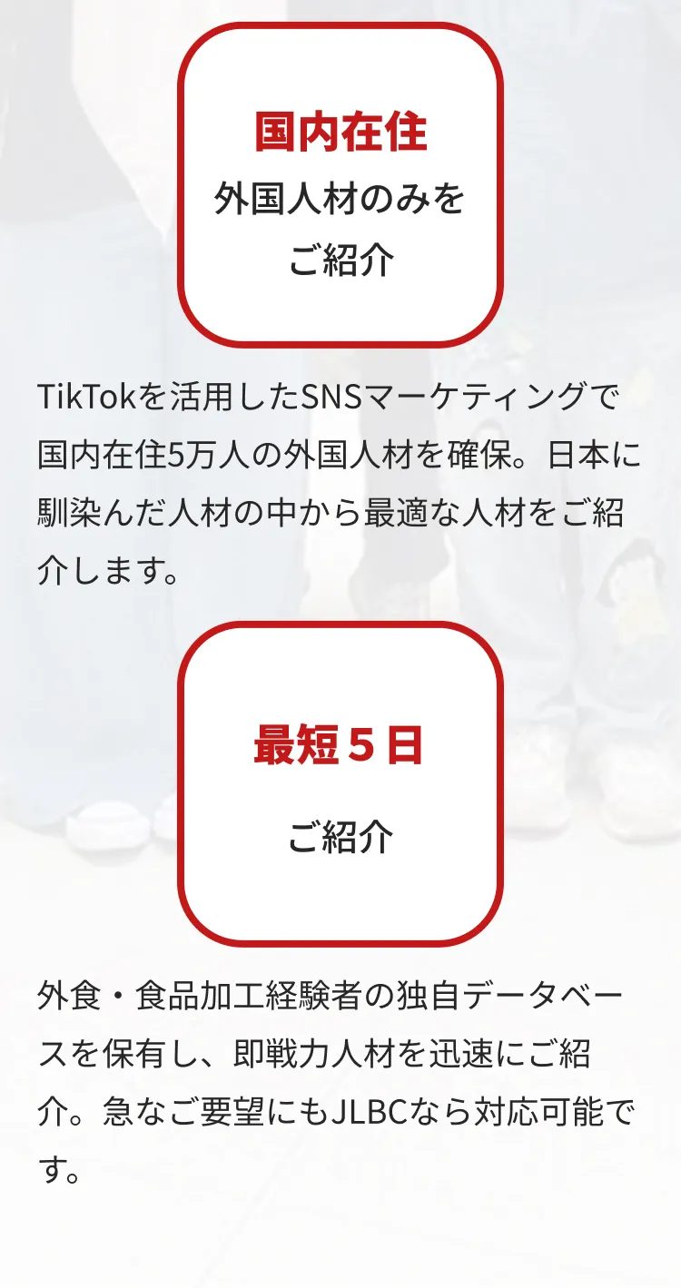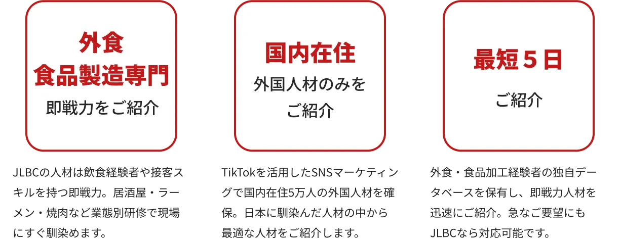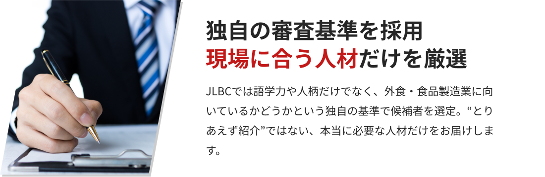 JLBCでは語学力や人柄だけでなく、外食・食品製造業に向いているかどうかという独自の基準で候補者を選定。“とりあえず紹介”ではない、本当に必要な人材だけをお届けします。