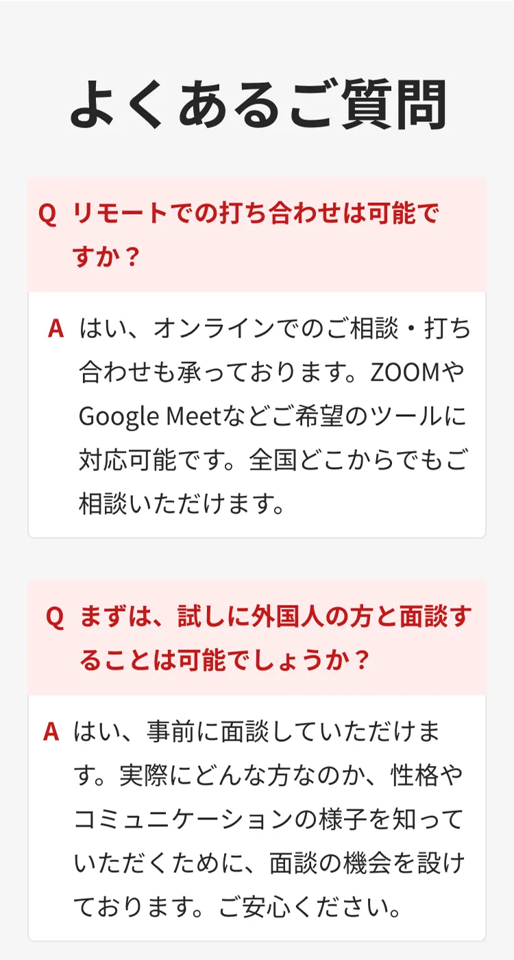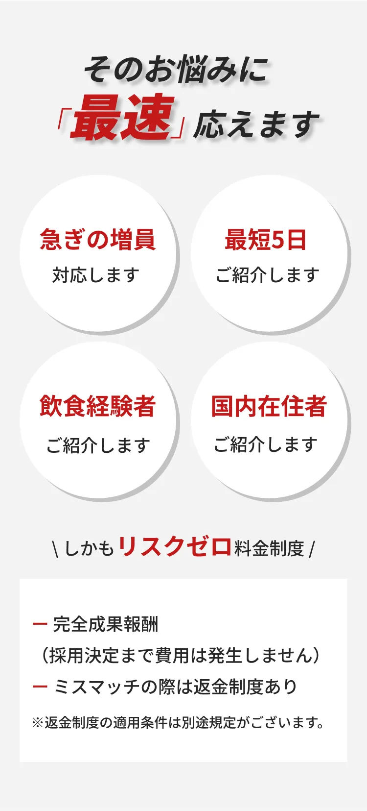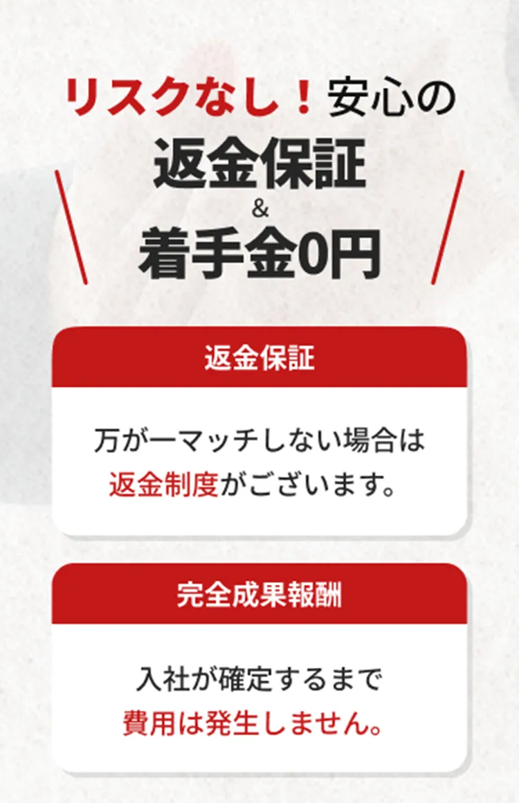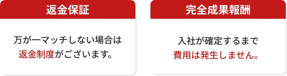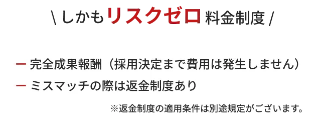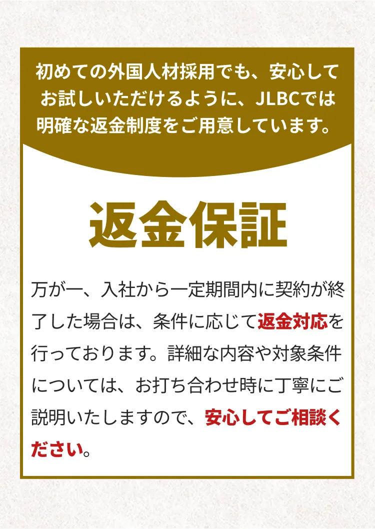 初めての外国人材採用でも、不安なく始めていただけるように、JLBCでは万が一の返金保証と、成果が出るまで費用が発生しない成果報酬制(着手金0円)を採用しています。コスト面のリスクを最小限に抑え、安心して導入を検討いただけます。