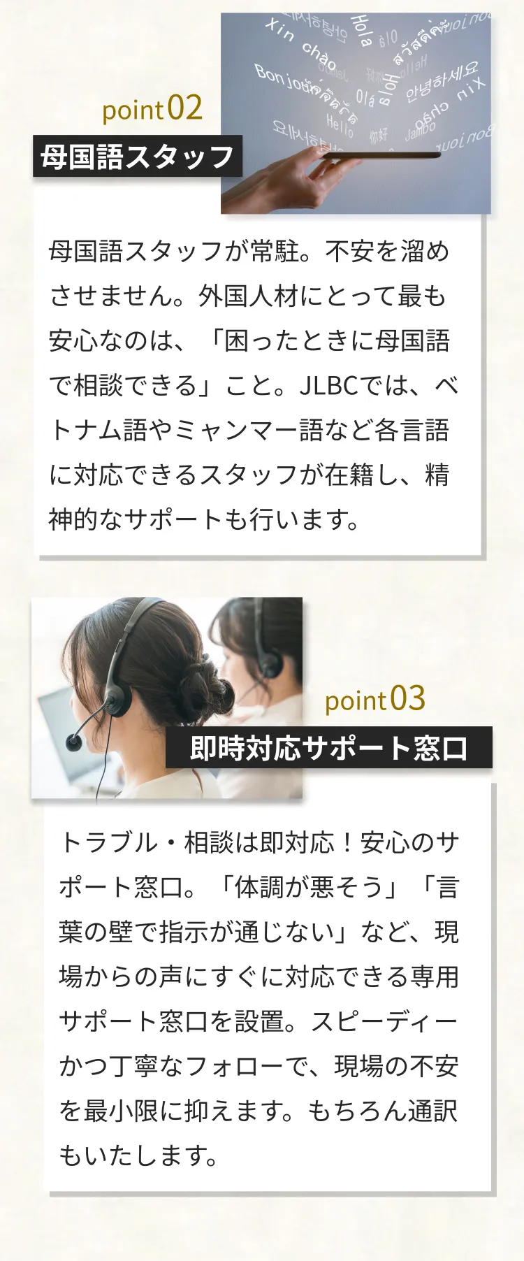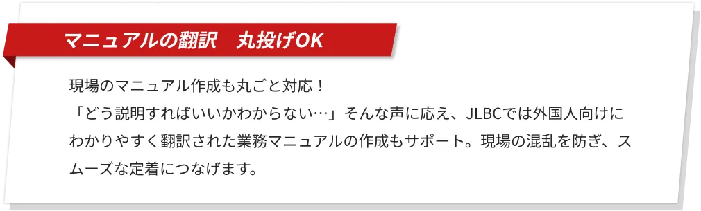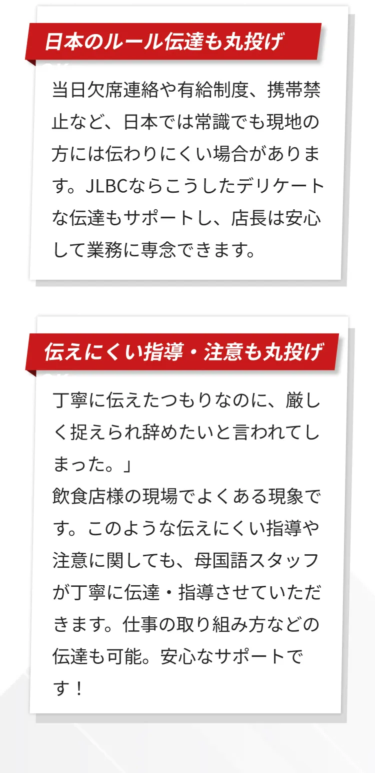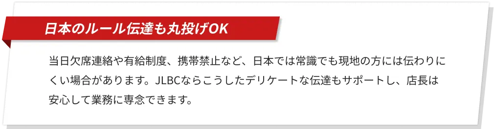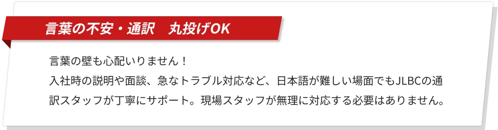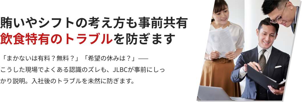こうした現場でよくある認識のズレも、JLBCが事前にしっかり説明。入社後のトラブルを未然に防ぎます。