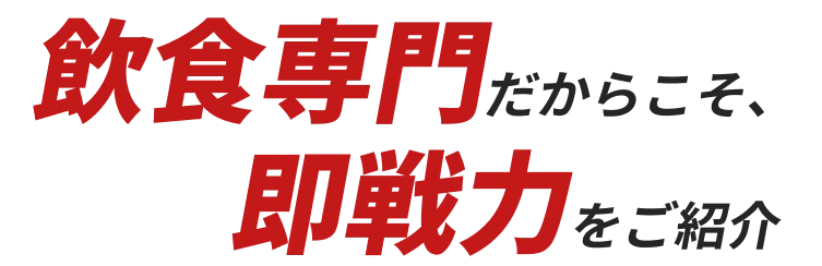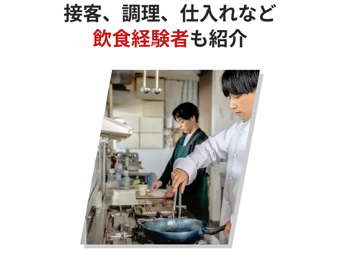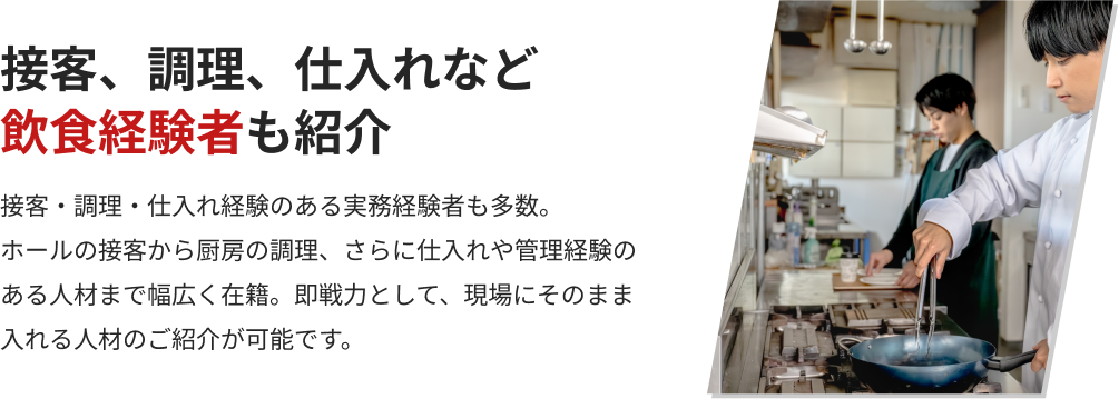 接客・調理・仕入れ経験のある実務経験者も多数。 ホールの接客から厨房の調理、さらに仕入れや管理経験のある人材まで幅広く在籍。即戦力として、現場にそのまま入れる人材のご紹介が可能です。