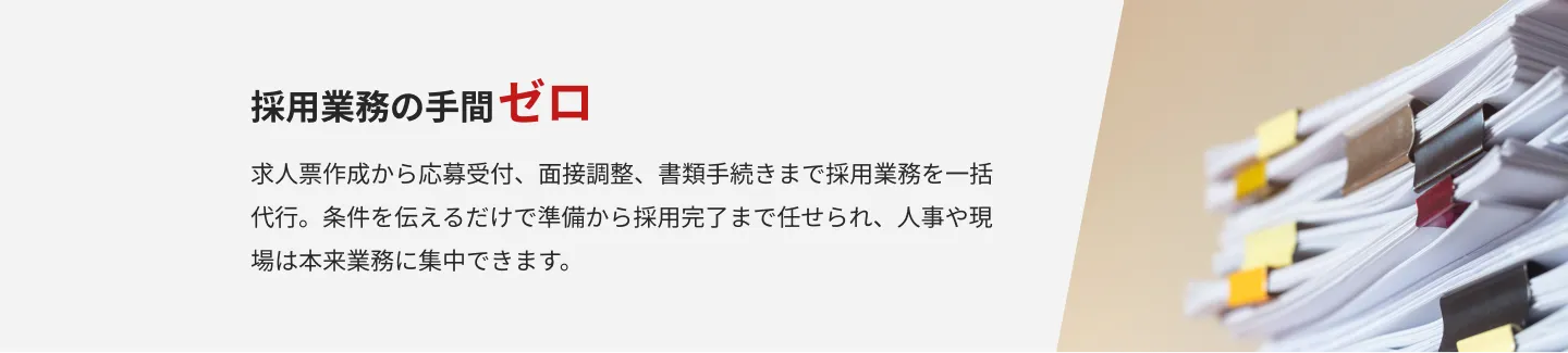 急な欠員や繁忙期の増員にも柔軟に対応し、スピードと質を両立させたご提案が可能です。採用活動の負担を大幅に軽減しながら、より確実で効率的な人材確保を実現します。