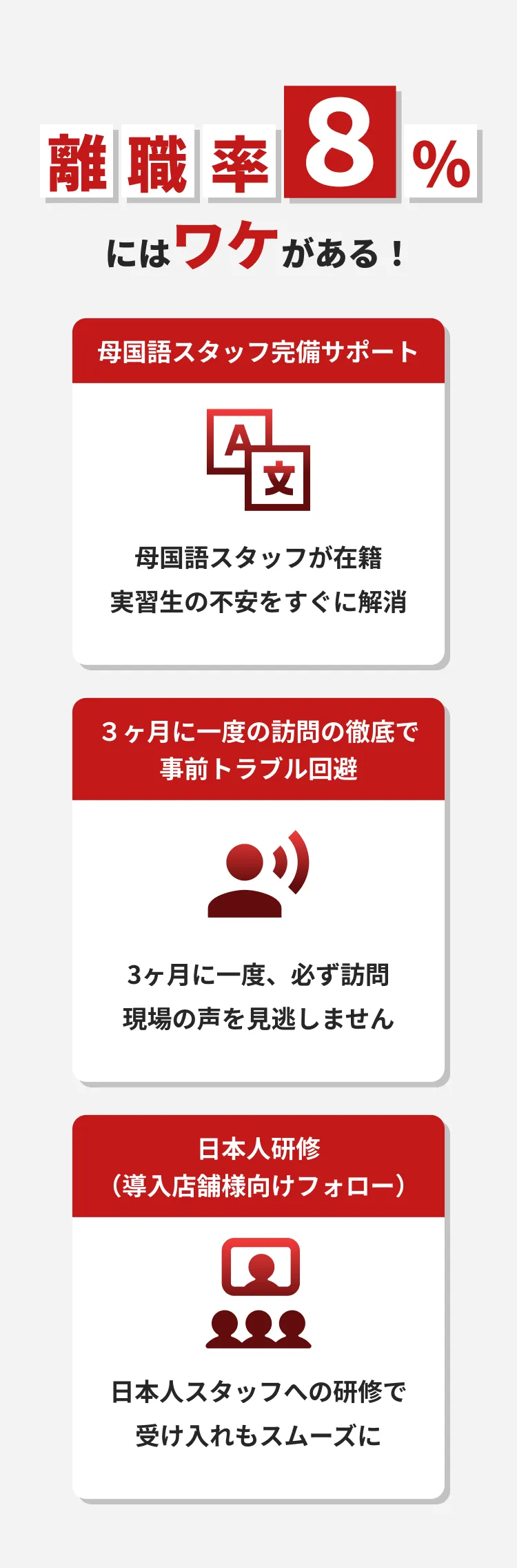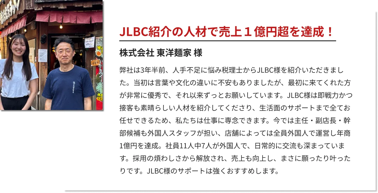 弊社は3年半前、人手不足に悩み税理士からJLBC様を紹介いただきました。当初は言葉や文化の違いに不安もありましたが、最初に来てくれた方が非常に優秀で、それ以来ずっとお願いしています。JLBC様は即戦力かつ接客も素晴らしい人材を紹介してくださり、生活面のサポートまで全てお任せできるため、私たちは仕事に専念できます。今では主任・副店長・幹部候補も外国人スタッフが担い、店舗によっては全員外国人で運営し年商1億円を達成。社員11人中7人が外国人で、日常的に交流も深まっています。採用の煩わしさから解放され、売上も向上し、まさに願ったり叶ったりです。JLBC様のサポートは強くおすすめします。