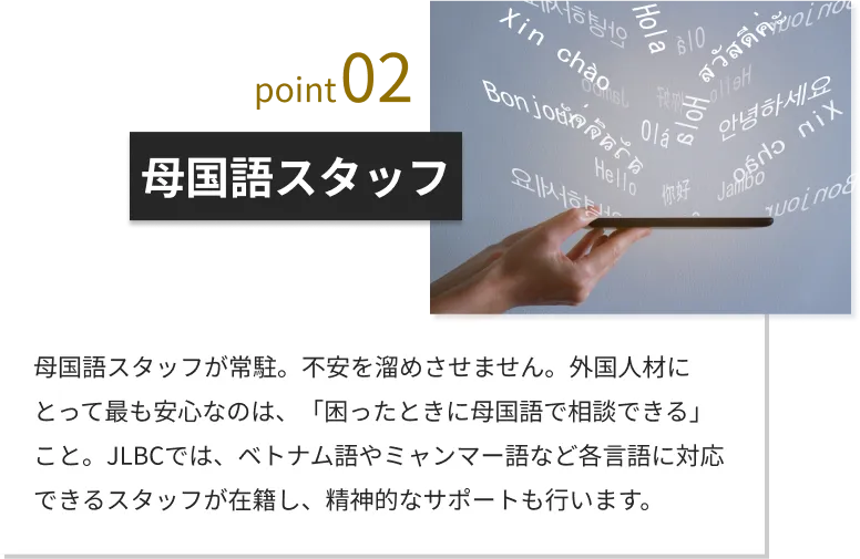 「働くことに、国境のない社会を」――これが私たちJLBCの揺るぎない理念です。国境を越えて挑戦する意欲ある人材と、人材不足に悩む日本企業をつなぐことで、双方にとって価値ある出会いを実現してまいりました。私たちは単なるマッチングではなく、世界と日本の労働環境を結ぶ“架け橋”として、クライアント様の業績向上と持続的な成長に貢献いたします。グローバルな視点と地域に根差したサポートを融合させ、真に信頼されるパートナー企業であり続けることをお約束いたします。