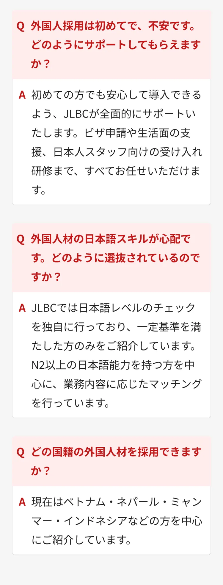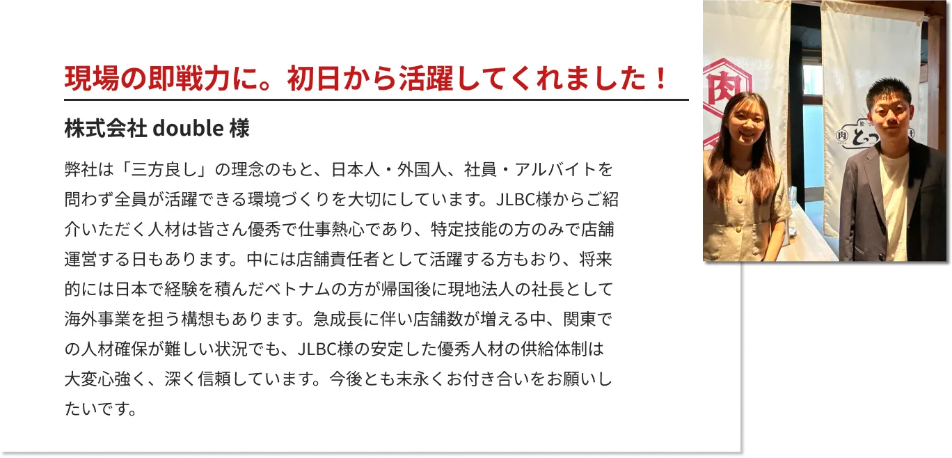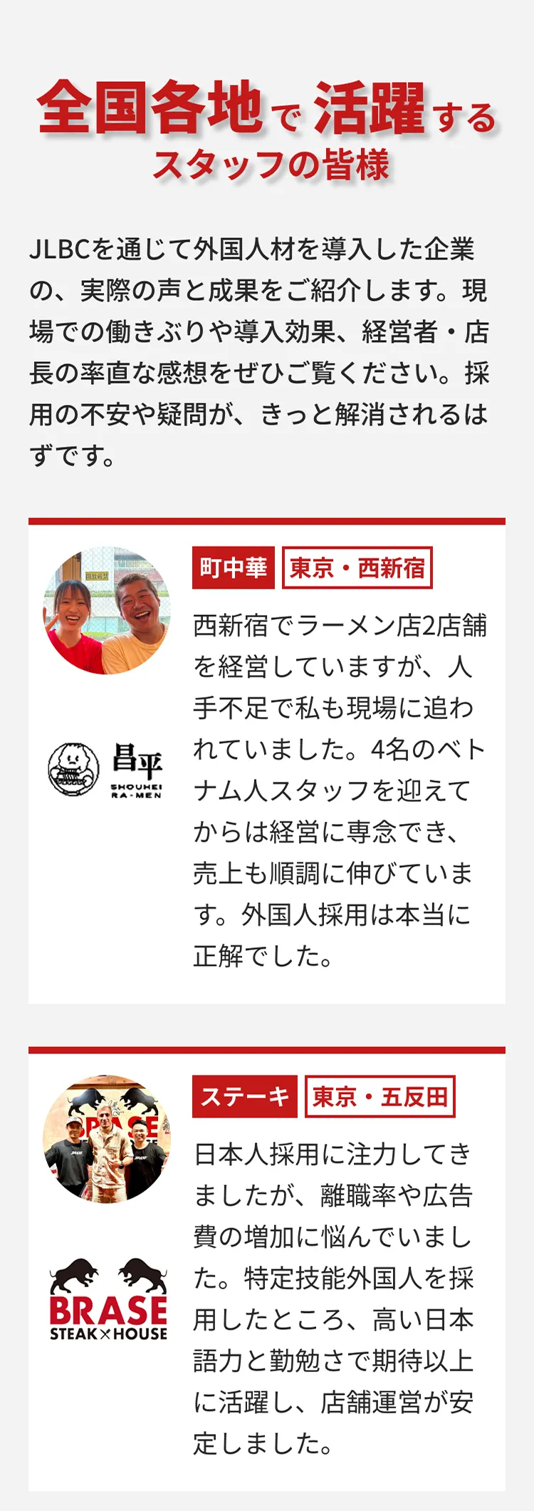 JLBCを通じて外国人材を導入した企業の、実際の声と成果をご紹介します。