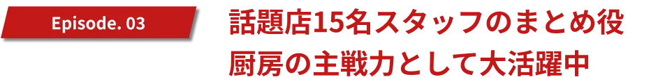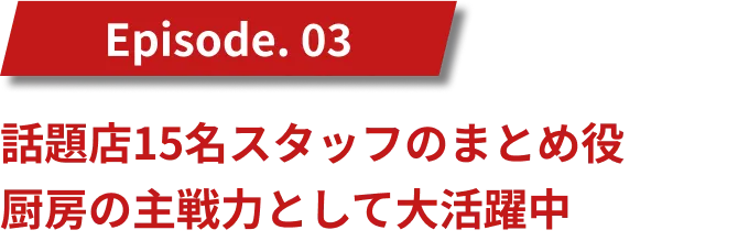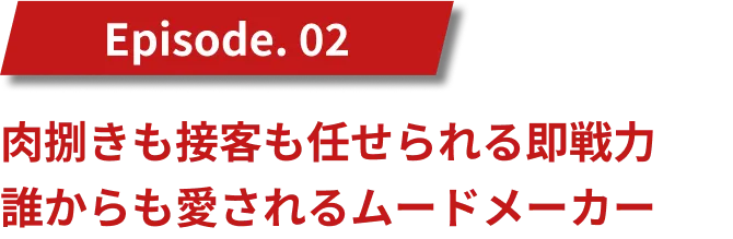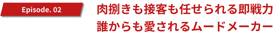 スピードと正確さを兼ね備えた肉捌き技術を習得。もちろん、丁寧なカットも行います。一定の基準を保った調理により安定した品質管理を実現し、お客様に信頼される美味しい料理の提供を支えることで、店舗運営の重要な基盤を担う欠かせない戦力として貢献しています。