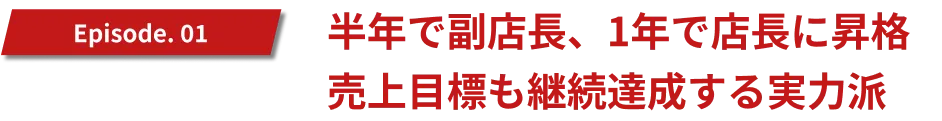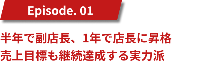 「仕事に真面目で、入社当初は予習復習を怠らず、すぐ欠かせない戦力になってくれました。新しいことにも積極的に挑戦する姿勢が素晴らしい。職場の雰囲気を明るくしてくれるムードメーカでもあります。今後は、さらに活躍の場を広げて、是非とも店長として活躍してくれることを期待しています。」