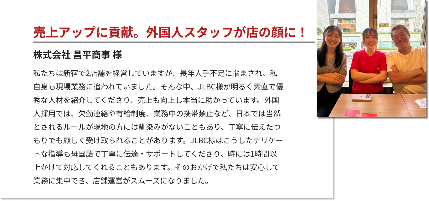 私たちは新宿で2店舗を経営していますが、長年人手不足に悩まされ、私自身も現場業務に追われていました。そんな中、JLBC様が明るく素直で優秀な人材を紹介してくださり、売上も向上し本当に助かっています。外国人採用では、欠勤連絡や有給制度、業務中の携帯禁止など、日本では当然とされるルールが現地の方には馴染みがないこともあり、丁寧に伝えたつもりでも厳しく受け取られることがあります。JLBC様はこうしたデリケートな指導も母国語で丁寧に伝達・サポートしてくださり、時には1時間以上かけて対応してくれることもあります。そのおかげで私たちは安心して業務に集中でき、店舗運営がスムーズになりました。