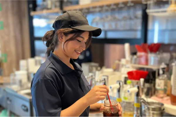 ドリンクの提供も担当しています。素早く丁寧な動きと効率的な作業手順により接客の満足度を高めながら、同時進行する複数の業務を的確に処理するマルチタスク能力を発揮し、忙しい現場での円滑な店舗運営に貢献しています。