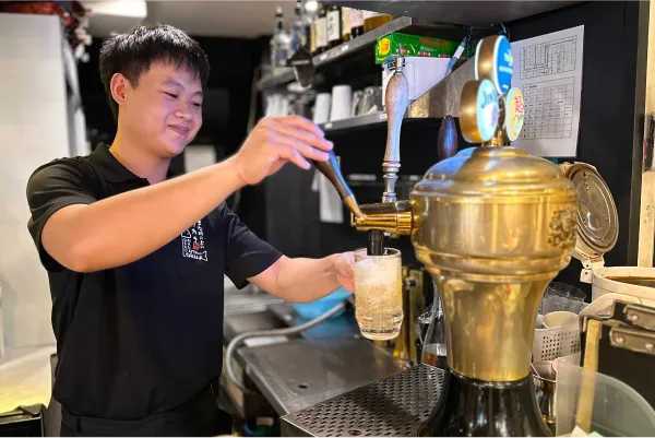 接客の一環としてドリンク提供も担当。流暢な日本語を使いこなし、笑顔を絶やさず、お客様に安心感を届けています。