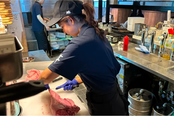 スピードと正確さを兼ね備えた肉捌きは大きな強み。安定した品質管理を実現し、店舗運営の基盤を支える欠かせない戦力となっています。