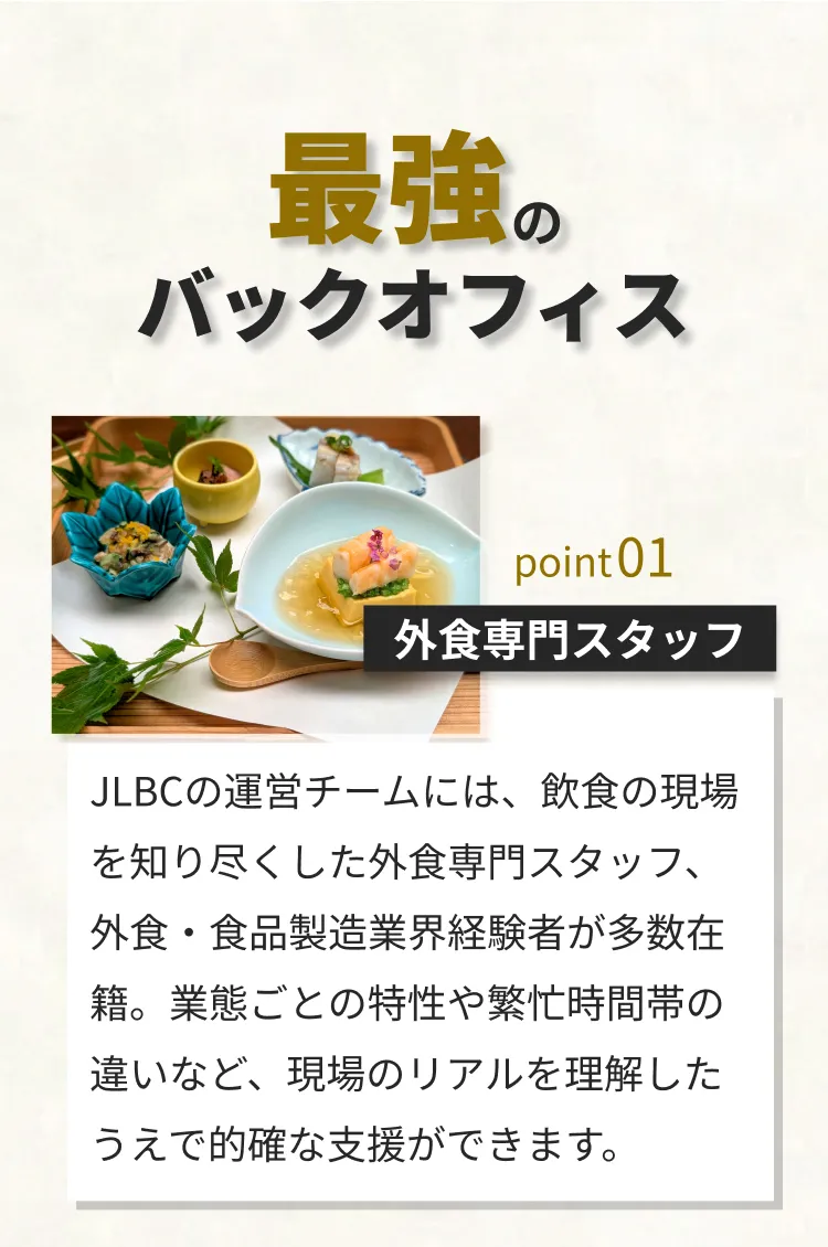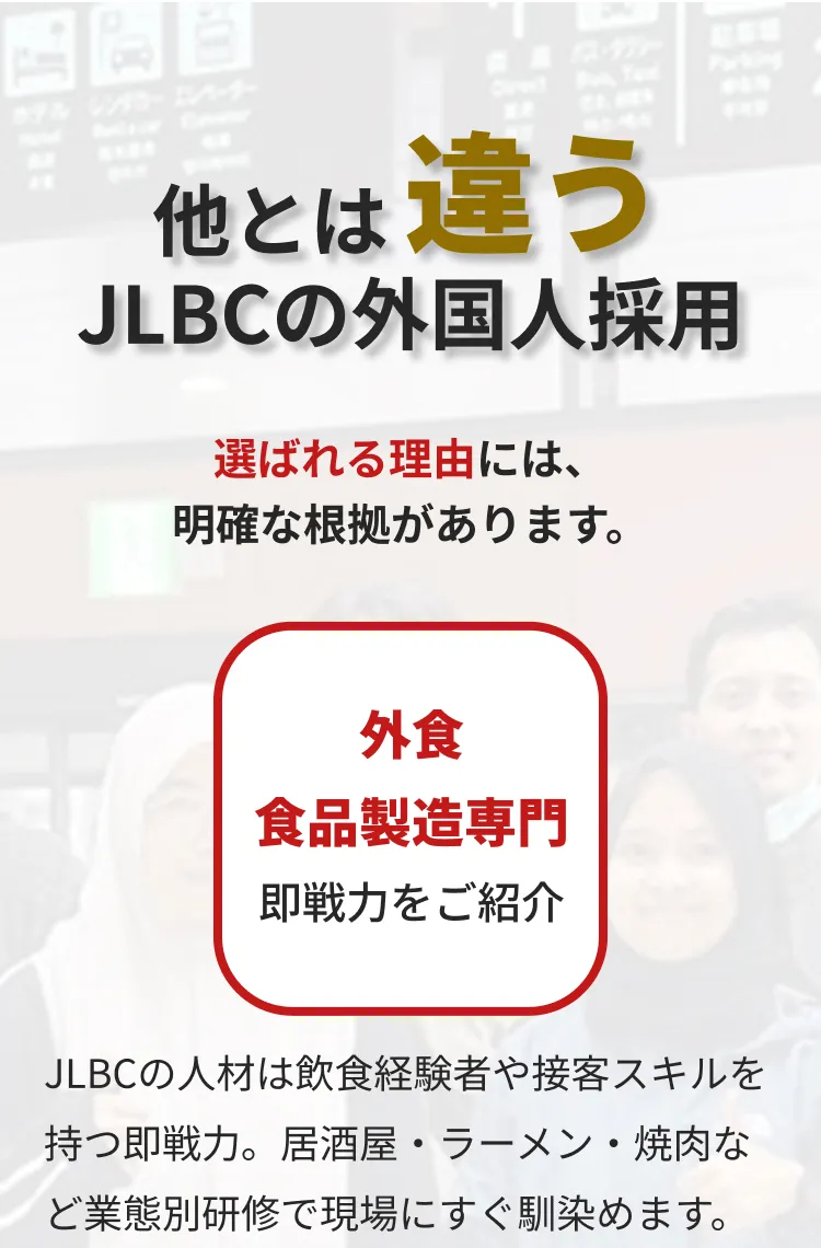 私たちJLBCは、日本の外食産業・食品製造業が直面する人材不足の課題を解決するため、即戦力となる外国人材を安心して活用いただける仕組みを築いてまいりました。単なる人材紹介にとどまらず、採用から定着までを一貫してサポートし、文化や習慣の違いによる不安を解消することで、現場に本当の安心と安定をお届けすることを使命としています。今後も、企業様と共に成長し続け、日本の外食産業・食品製造産業を支える存在でありたいと考えております。
