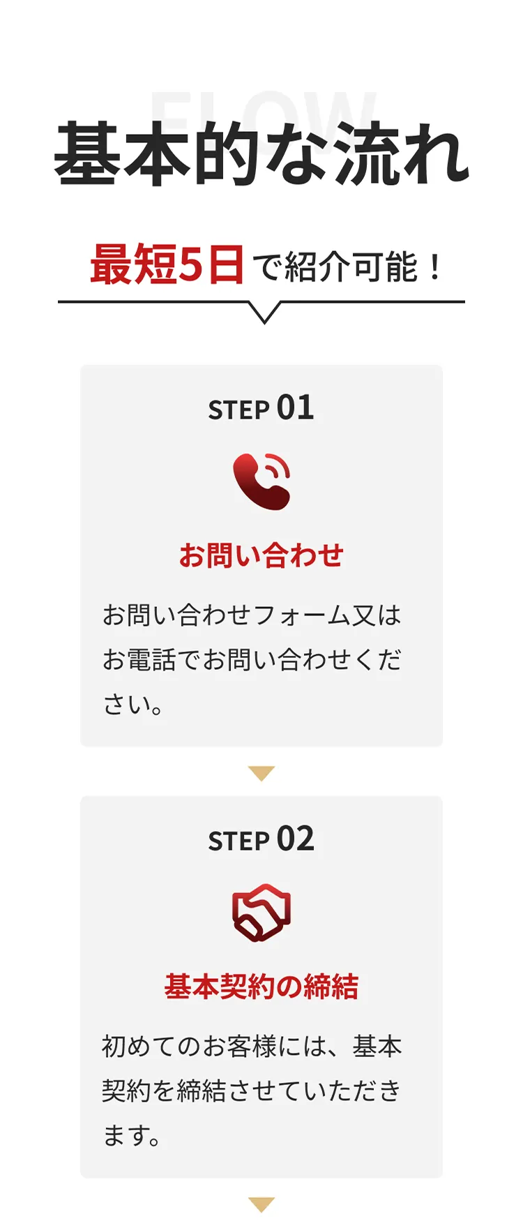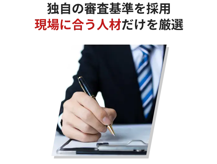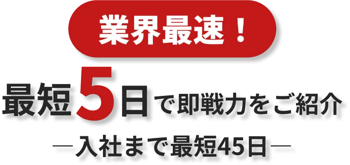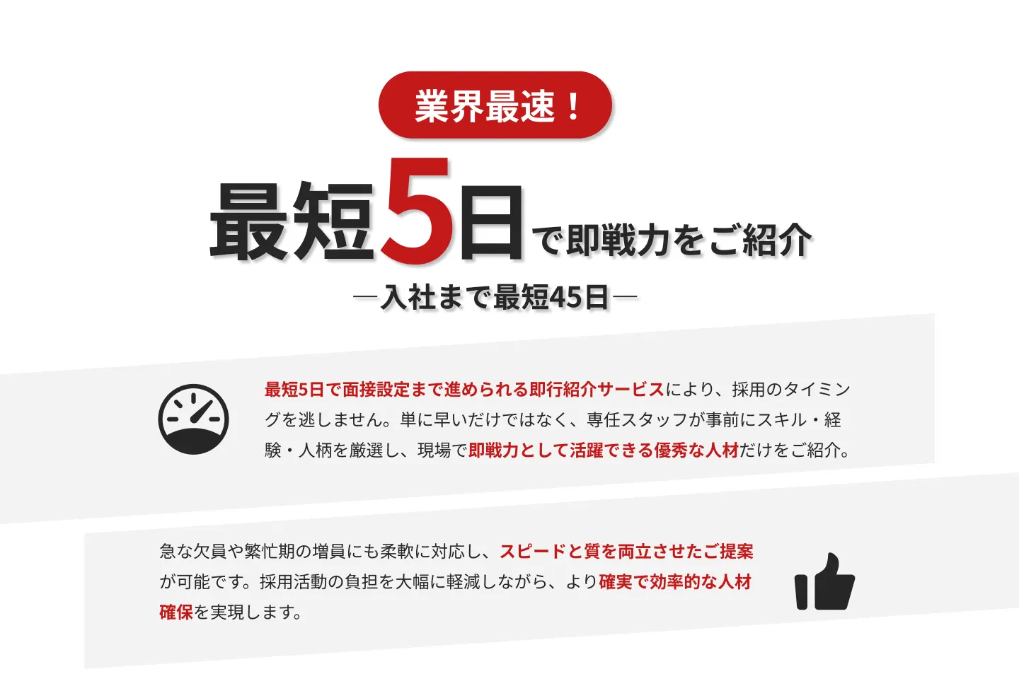 最短5日で面接設定まで進められる即行紹介サービスにより、採用のタイミングを逃しません。単に早いだけではなく、専任スタッフが事前にスキル・経験・人柄を厳選し、現場で即戦力として活躍できる優秀な人材だけをご紹介。