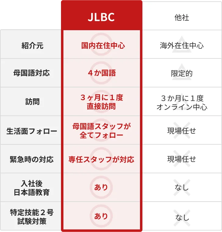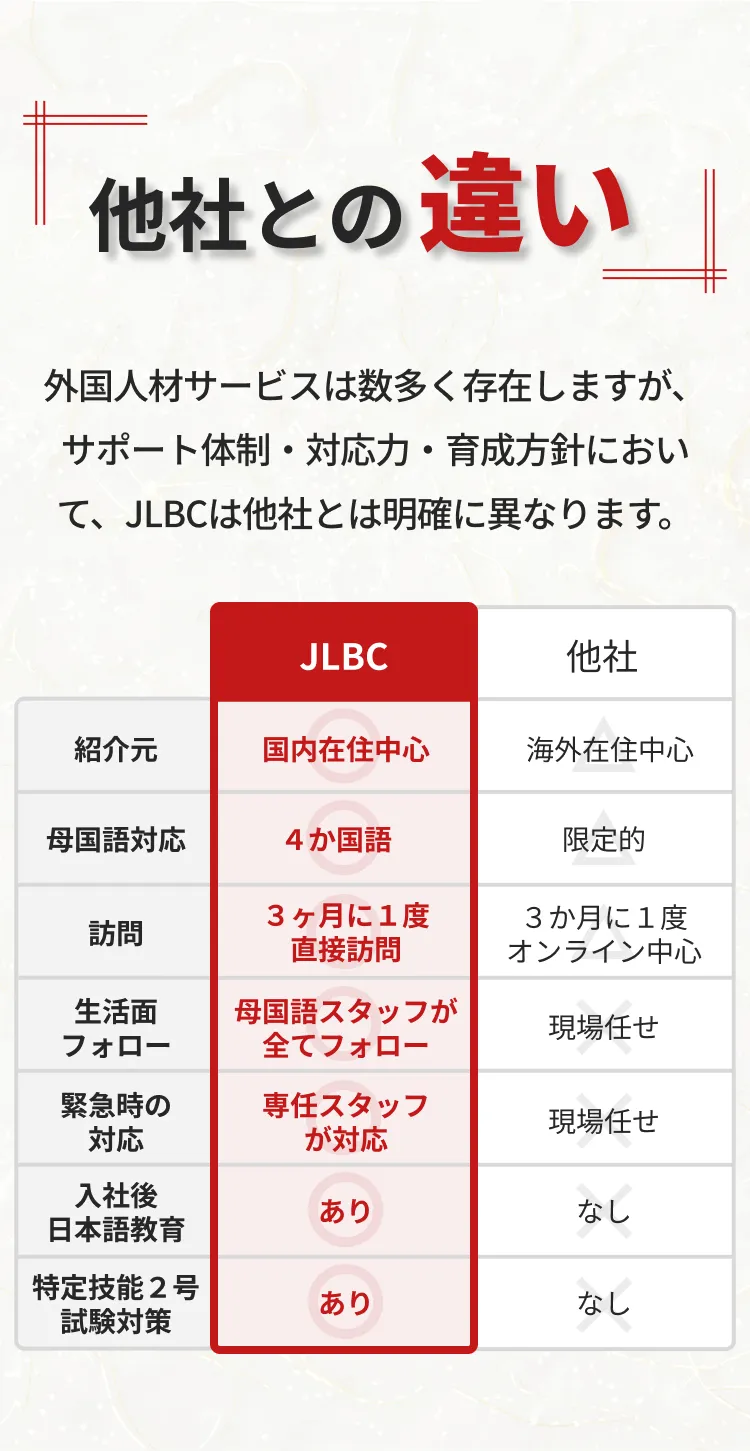 サポート体制・対応力・育成方針において、JLBCは他社とは明確に異なります。